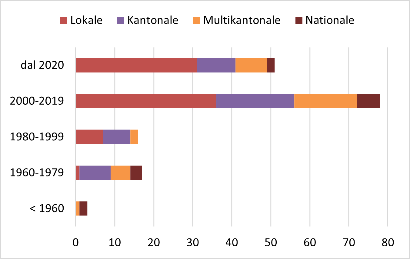 Ältere und damit oft besser etablierte Initiativen sind häufig auf nationaler Ebene oder in mehreren Kantonen aktiv, während jüngere Initiativen überwiegend auf lokaler Ebene tätig sind.