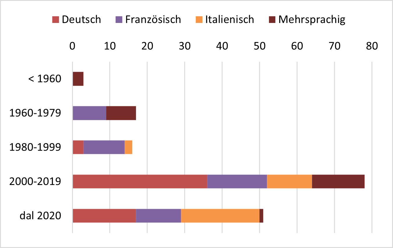 Die in das Inventar aufgenommenen Initiativen wurden zudem nach der Sprachregion, in der sie aktiv sind, klassifiziert. Initiativen, die in einem Kanton mit mehreren offiziellen Sprachen oder in mehreren Kantonen unterschiedlicher Sprachregionen durchgeführt werden, gelten als mehrsprachig. Die Initiativen sind gut auf die drei Hauptsprachregionen verteilt; 26 davon erstrecken sich über mehr als eine Region.