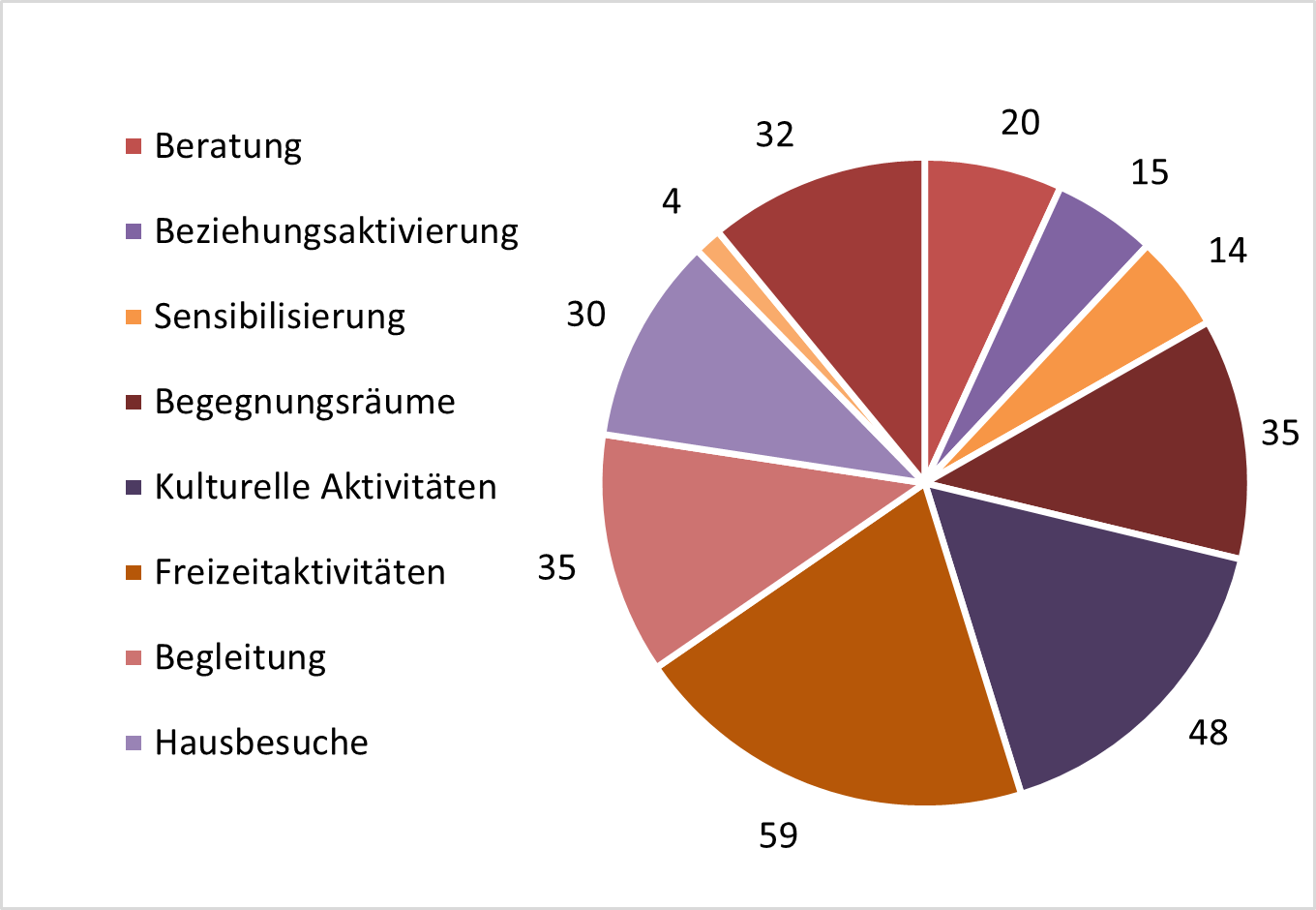 Die erfassten Initiativen wurden nach Interventionsmodalitäten kategorisiert. Insgesamt wurden 10 verschiedene Interventionsmodalitäten identifiziert. Die meisten Initiativen fallen in die Kategorien Freizeitaktivitäten (59) und kulturelle Aktivitäten (48). Psychologische Unterstützungsangebote (4) sind dagegen weniger vertreten.