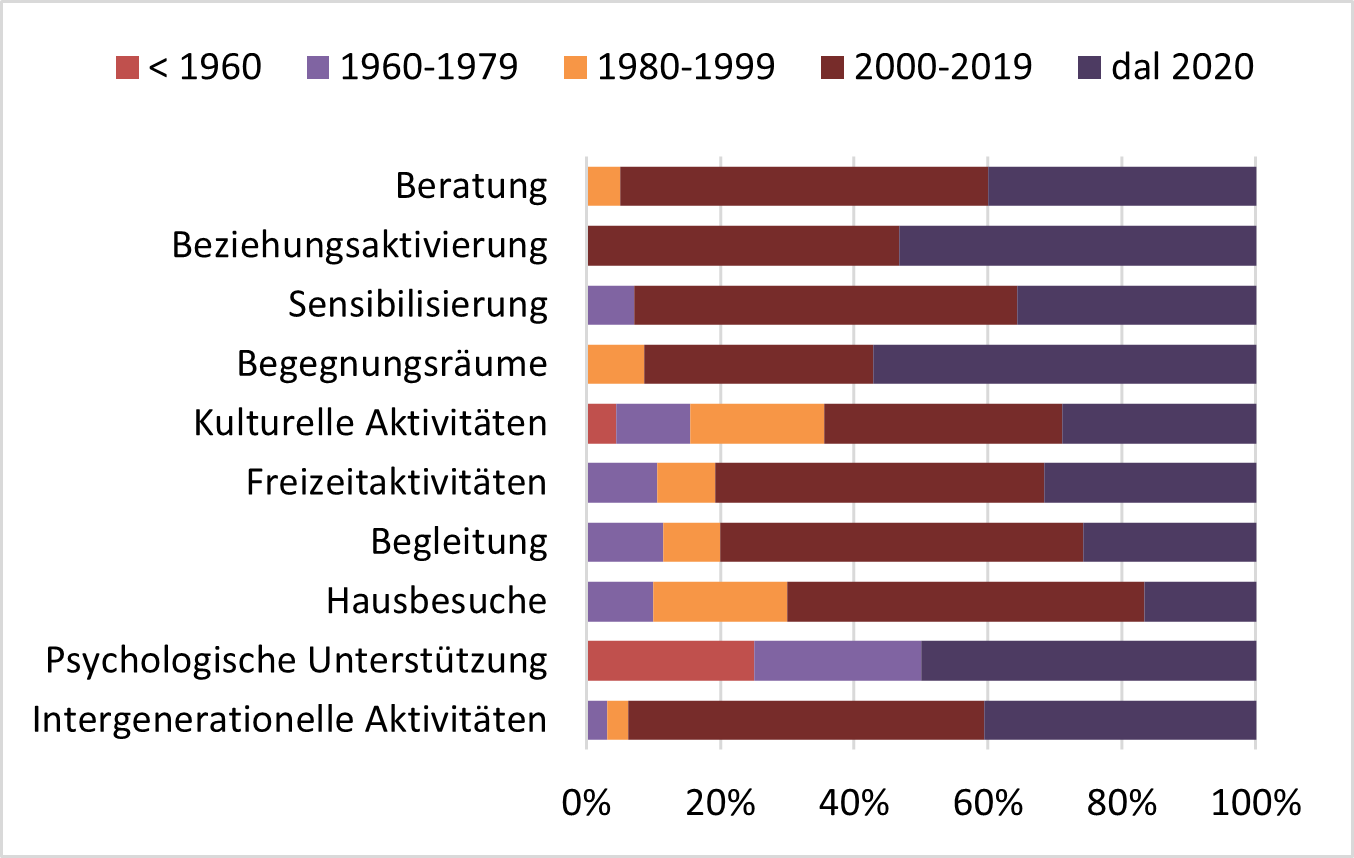 Initiativen, die psychologische Unterstützung anbieten, entstanden bereits vor den 1960er-Jahren. Freizeitaktivitäten, Begleitdienste und Hausbesuche wurden in den 1960er- und 1970er-Jahren eingeführt. Alle Initiativen zur Beziehungsaktivierung sowie fast alle Beratungsangebote und intergenerationellen Aktivitäten wurden im neuen Jahrtausend lanciert.
