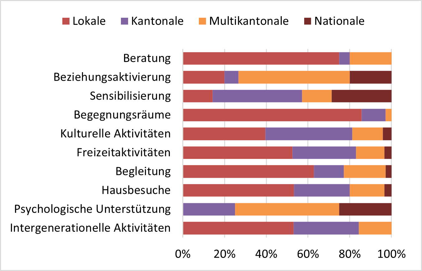 Die Initiativen, die Beratungs-, Begleitungs- oder Besuchsdienste anbieten, und solche, die Begegnungsräume zur Verfügung stellen, sind hauptsächlich auf lokaler Ebene aktiv. Initiativen zur Beziehungsaktivierung, Sensibilisierung und psychologischen Unterstützung sind hingegen eher auf überregionaler Ebene tätig.