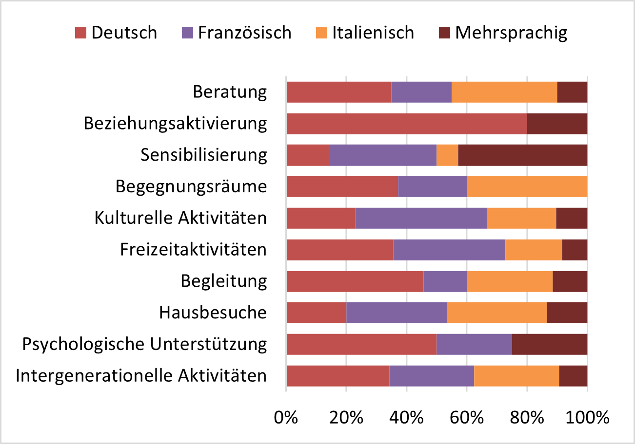 Initiativen zur Beziehungsaktivierung finden fast ausschliesslich in der Deutschschweiz statt. Freizeitaktivitäten und kulturelle Aktivitäten sind in der Romandie stärker vertreten. In der italienischen Schweiz gibt es zahlreiche Begegnungsräume und Beratungsangebote.