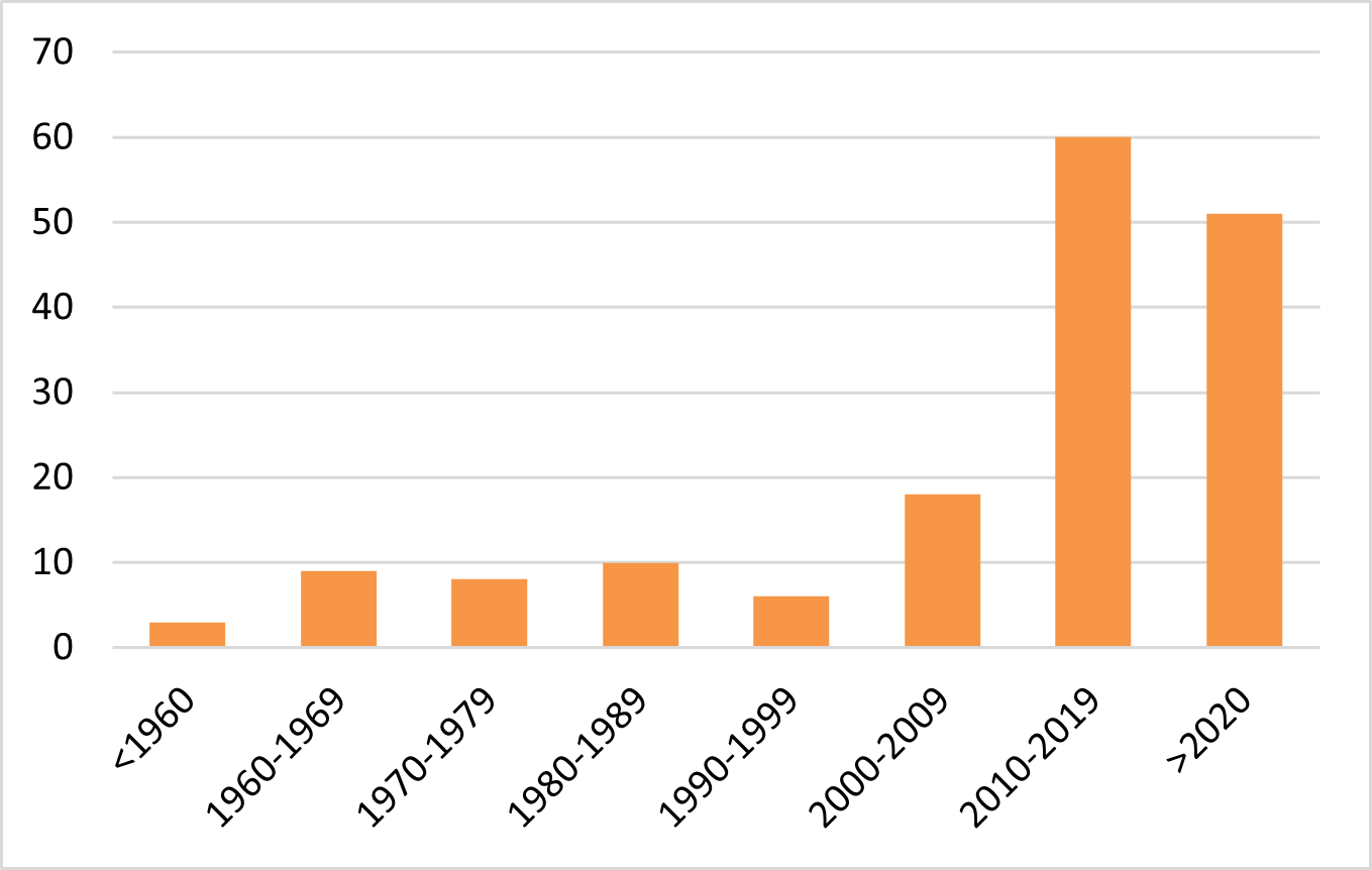Les initiatives ont été classées en fonction de leur période de début d’activité. L’initiative la plus ancienne, « Cours formatifs et culturels », a vu le jour dans les années 1950. La majorité des initiatives a été créée au cours du nouveau millénaire, et leur nombre est en augmentation. Depuis 2020 seulement, plus de 50 initiatives ont été créées.