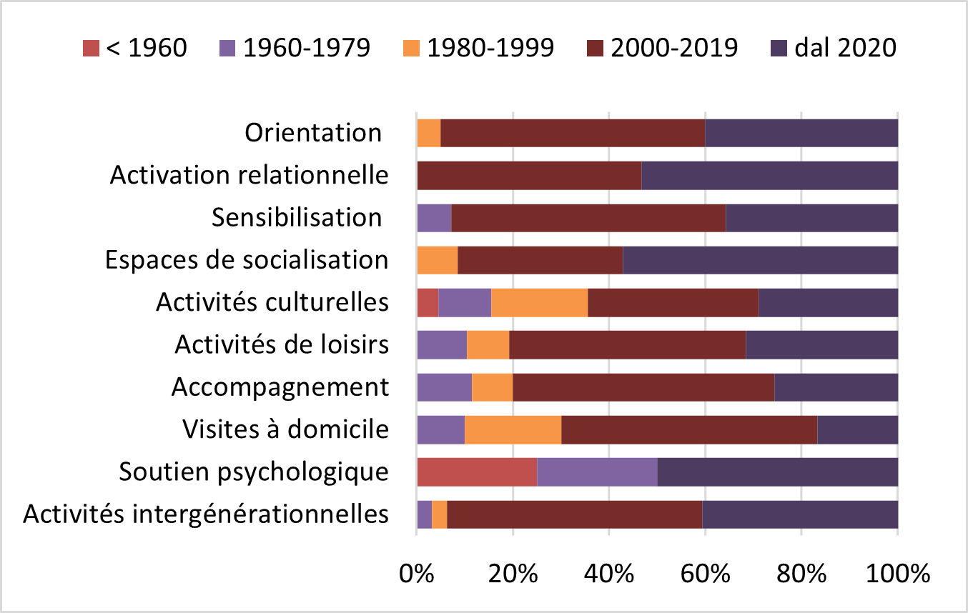 Les initiatives proposant une assistance psychologique sont apparues déjà avant les années 1960. Les activités de loisirs, les services d’accompagnement et les visites à domicile ont été introduits dans les années 1960 et 1970. Toutes les initiatives d’activation relationnelle, ainsi que la quasi-totalité de celles d’orientation et intergénérationnelles, sont nées au cours du nouveau millénaire.