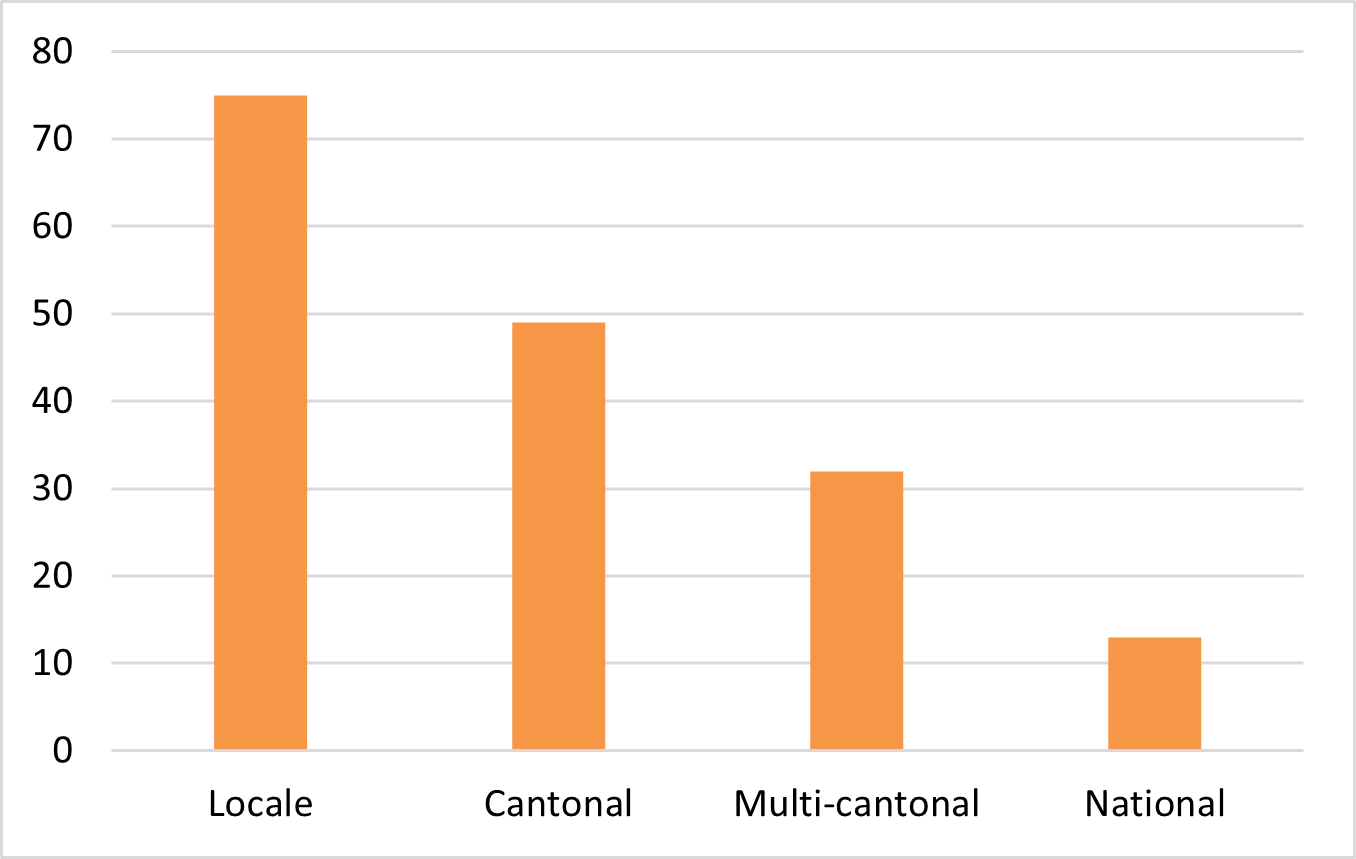 Les initiatives ont été classées selon leur niveau de diffusion, c’est-à-dire en fonction de l’ampleur de leur zone d’intervention. Les initiatives locales sont mises en œuvre dans une ou plusieurs communes voisines ou dans des quartiers contigus. Celles de niveau cantonal couvrent l’ensemble du territoire d’un canton. On parle d’initiatives multi-cantonales lorsqu’elles sont actives dans deux cantons ou plus, sans toutefois s’étendre à l’ensemble du pays. Enfin, les initiatives dites nationales interviennent sur tout le territoire de la Confédération. La grande majorité des initiatives (124) est mise en œuvre à l’échelle locale ou cantonale.