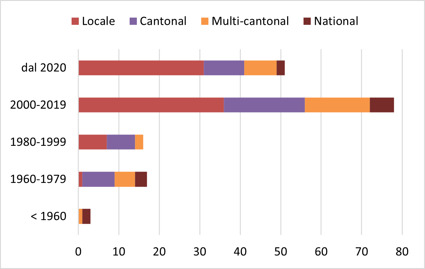 Les initiatives les plus anciennes, et donc généralement plus consolidées, se déroulent souvent au niveau national ou dans plusieurs cantons, tandis que les initiatives plus récentes sont actives principalement à l’échelle locale.