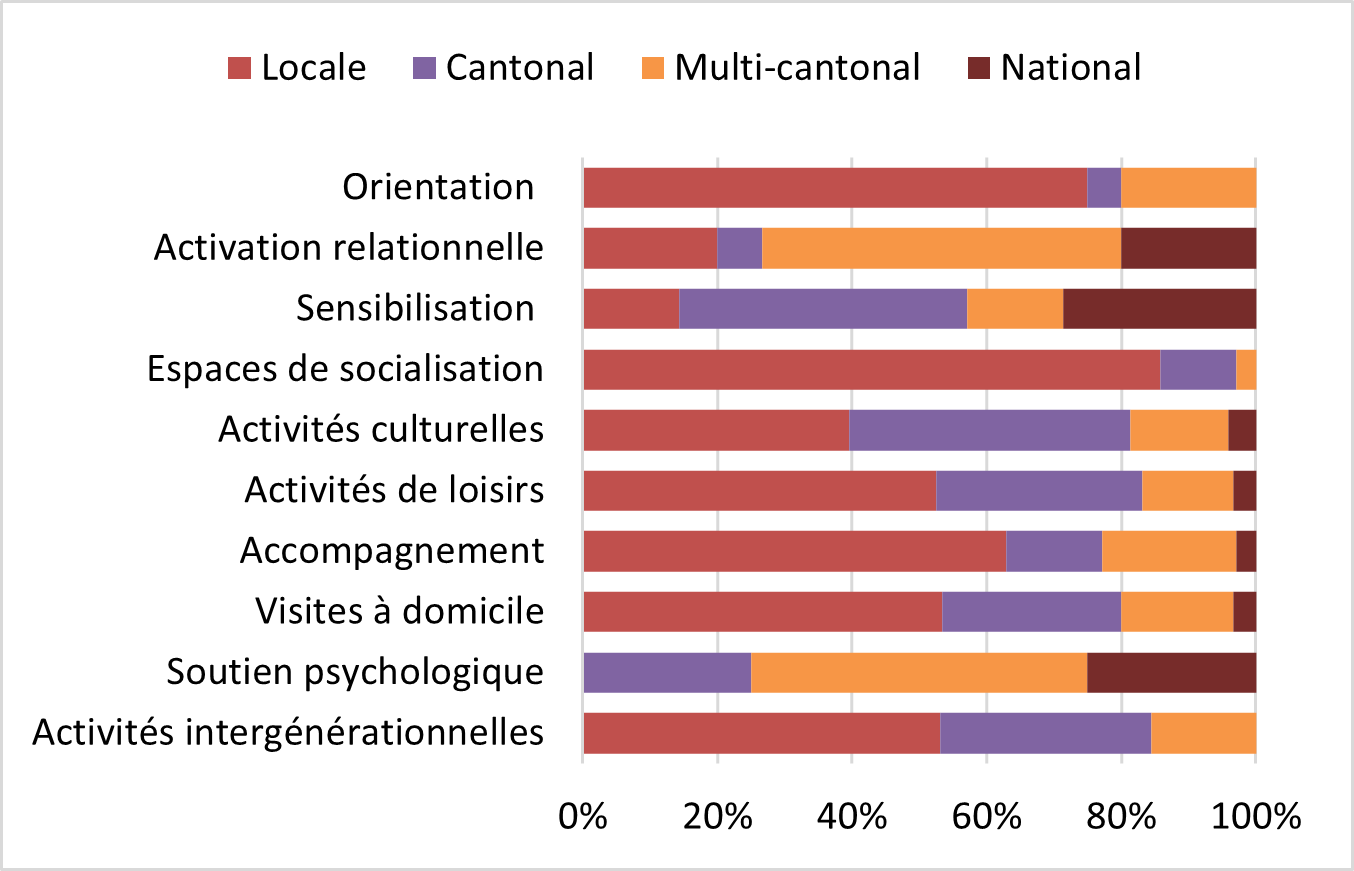 Les initiatives d’orientation, d’accompagnement, ainsi que celles proposant des visites à domicile ou des espaces de socialisation, sont principalement actives au niveau local. À une échelle plus large, on retrouve davantage d’initiatives axées sur l’activation relationnelle, la sensibilisation ou le soutien psychologique.