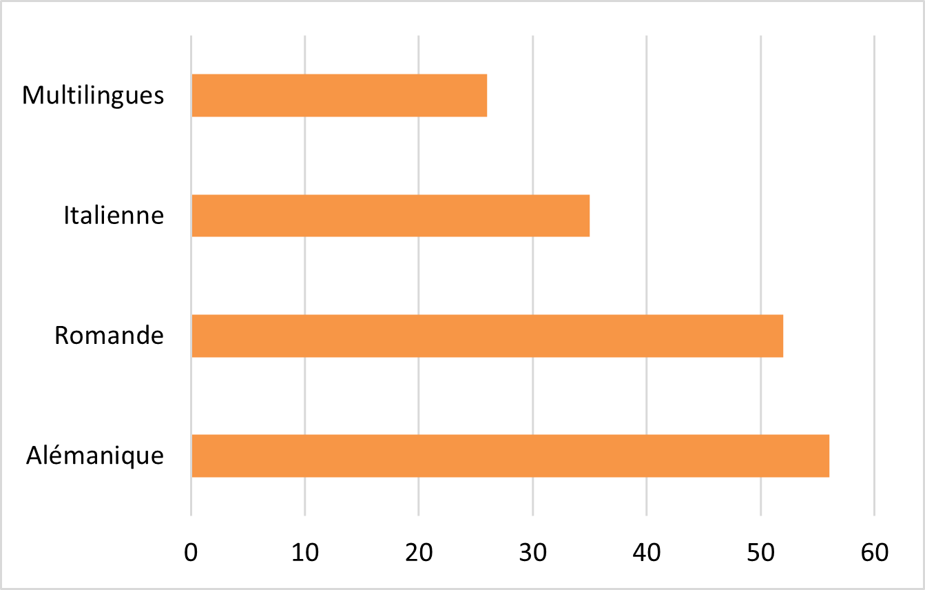 Les initiatives incluses dans l’inventaire ont également été classées selon la région linguistique dans laquelle elles sont actives. Celles qui se déroulent dans un canton avec plusieurs langues officielles ou dans plusieurs cantons appartenant à des régions linguistiques différentes sont qualifiées de multilingues. Les initiatives sont globalement bien réparties entre les trois principales régions linguistiques, et 26 d’entre elles couvrent plusieurs régions.