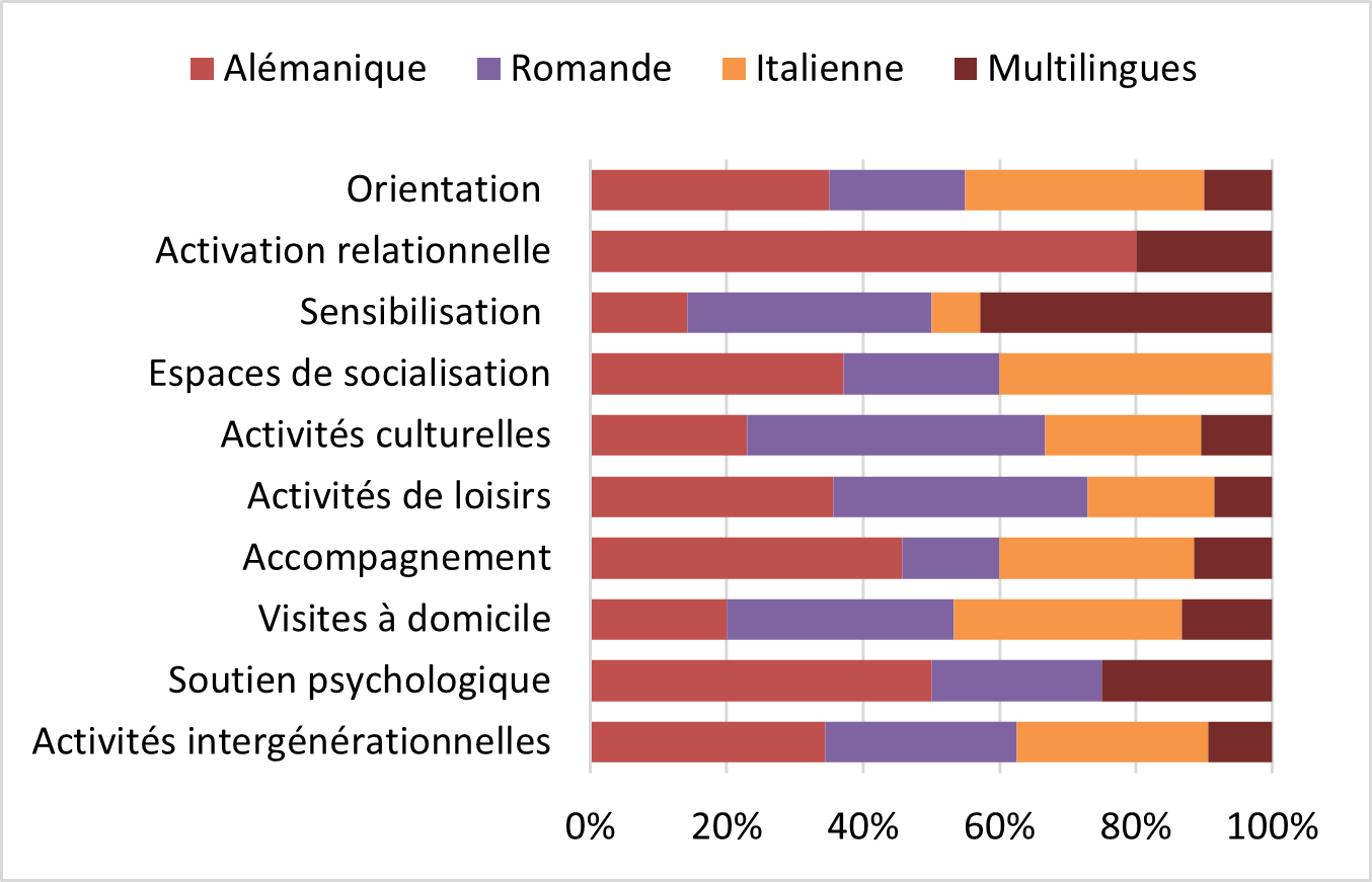 Les initiatives d’activation relationnelle sont presque toutes en Suisse alémanique. Les activités de loisirs et culturelles sont davantage présentes en Suisse romande. Les espaces de socialisation et les activités d’orientation sont nombreuses en Suisse italienne.
